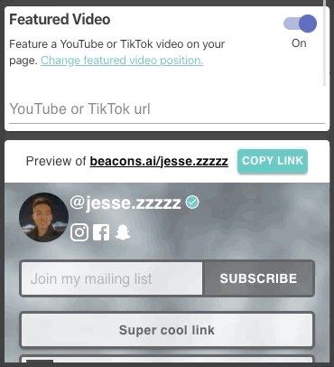 Trying to add some more personality to your Beacons page? You can embed a YouTube or TikTok video right onto the page.