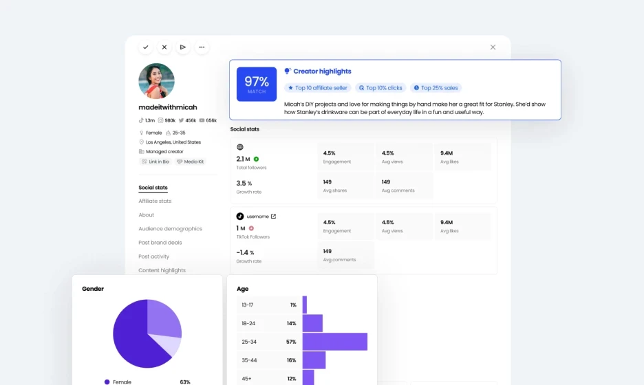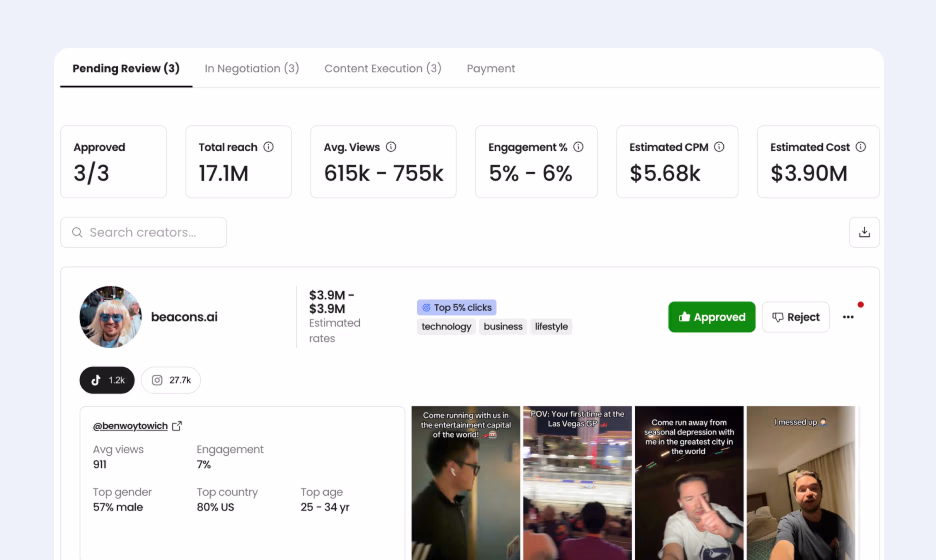 Go beyond follower counts with audience quality, relevance, and performance insights. Source creators who actually align with your brand.