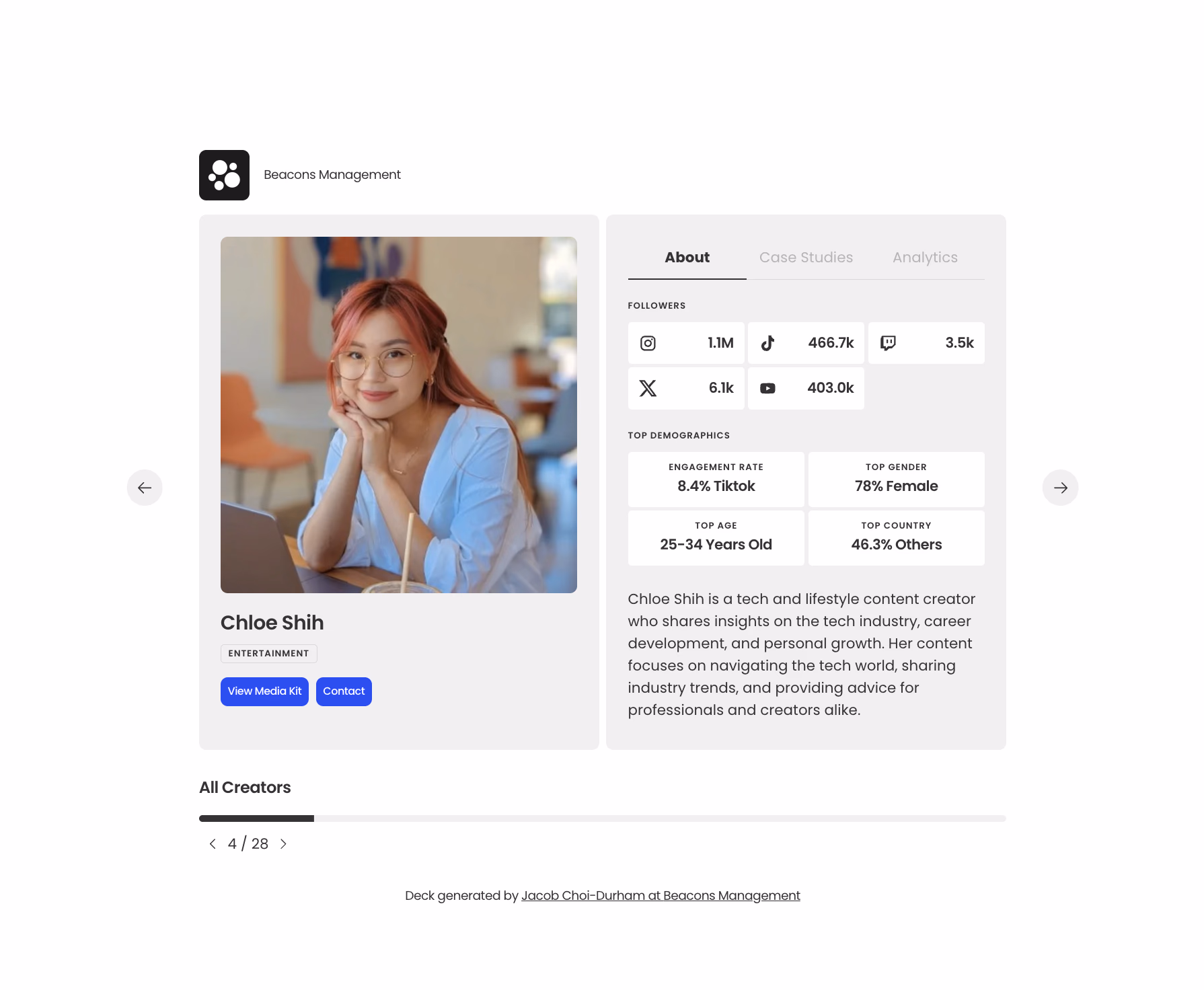 Instant, data-powered snapshots that highlight your creators’ reach, audience, and performance — so you can pitch talent to brands in seconds.